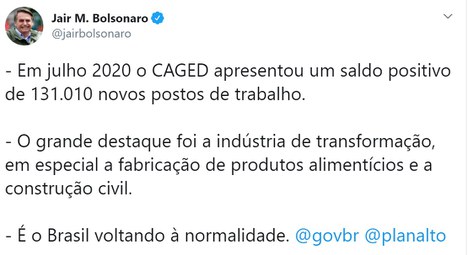 “É o Brasil voltando a normalidade”, comentou o Presidente Jair Bolsonaro, em suas redes sociais.