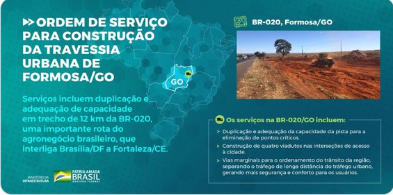 Já a travessia urbana de Formosa, na BR-020/GO, terá 12 quilômetros de extensão. Será feita a duplicação, vias marginais, construção de quatro viadutos e instalação de iluminação pública. Serão investidos R$ 86 milhões. “Essa obra começa a andar nesse exato momento. A obra vai proporcionar muita segurança, trafegabilidade, redução de acidentes, congestionamentos. É um trecho bastante movimentado, por lá transitam 12 mil veículos por dia. Isso vai beneficiar cerca de 150 mil pessoas”, afirmou Tarcísio Gomes de Freitas.