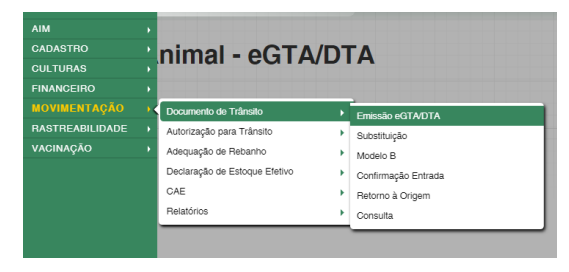 Menu - movimentação / Documento de Trânsito / Emissão e-GTA