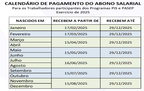 Em 2025, o calendário de pagamento do Abono Salarial referente ano-base 2023 foi unificado pelo mês de nascimento e instituído pela Resolução do CODEFAT n° 1.011, de 2024, os valores ficarão disponíveis aos trabalhadores até o fim do calendário em 29/12/2025, conforme tabela abaixo: