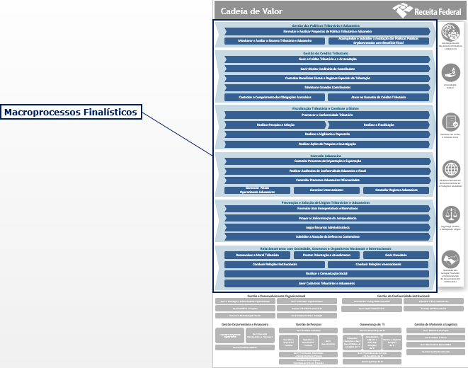 Os Macroprocessos Finalísticos estão ligados à essência do funcionamento e aos objetivos da organização e representam aqueles processos que efetivamente entregam valor aos clientes da RFB. São representados no formato de setas e indicam, ao seu lado, o principal valor entregue.