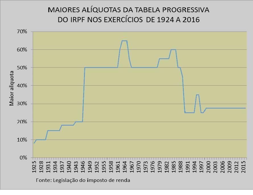 Maiores alíquotas da tabela progressiva do IRPF nos exercícios de 1924 a 2016