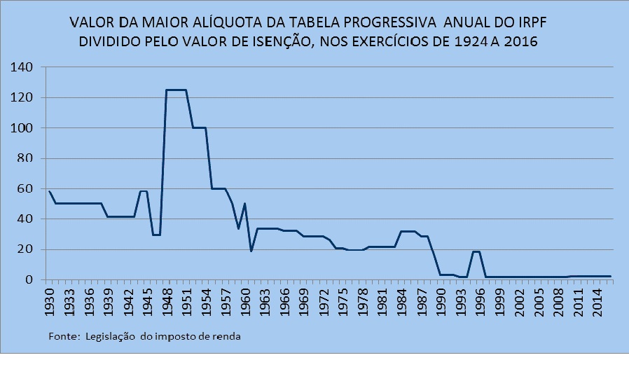 Valor da maior alíquota da tabela progressiva anual do IRPF dividido pelo valor de isenção, nos exercícios de 1924 a 2016