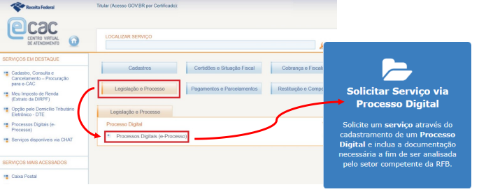 Para solicitar um dos serviços disponíveis via Processo Digital, o contribuinte deverá acessar o e-CAC e clicar em: