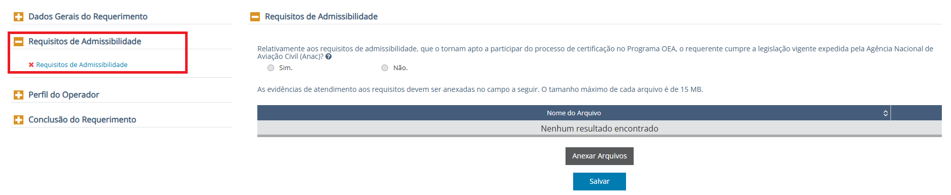 Nos Dados do Requerimento do OEA-Integrado Anac, aparecerão Requisitos de Admissibilidade e o Perfil do Operador.