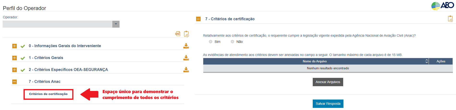O Perfil do Operador do requerimento OEA-Integrado Anac possui uma entrada única para a juntada de evidências de todos os critérios. Dessa forma, organize os documentos, de forma que eles demonstrem o cumprimento dos critérios de: