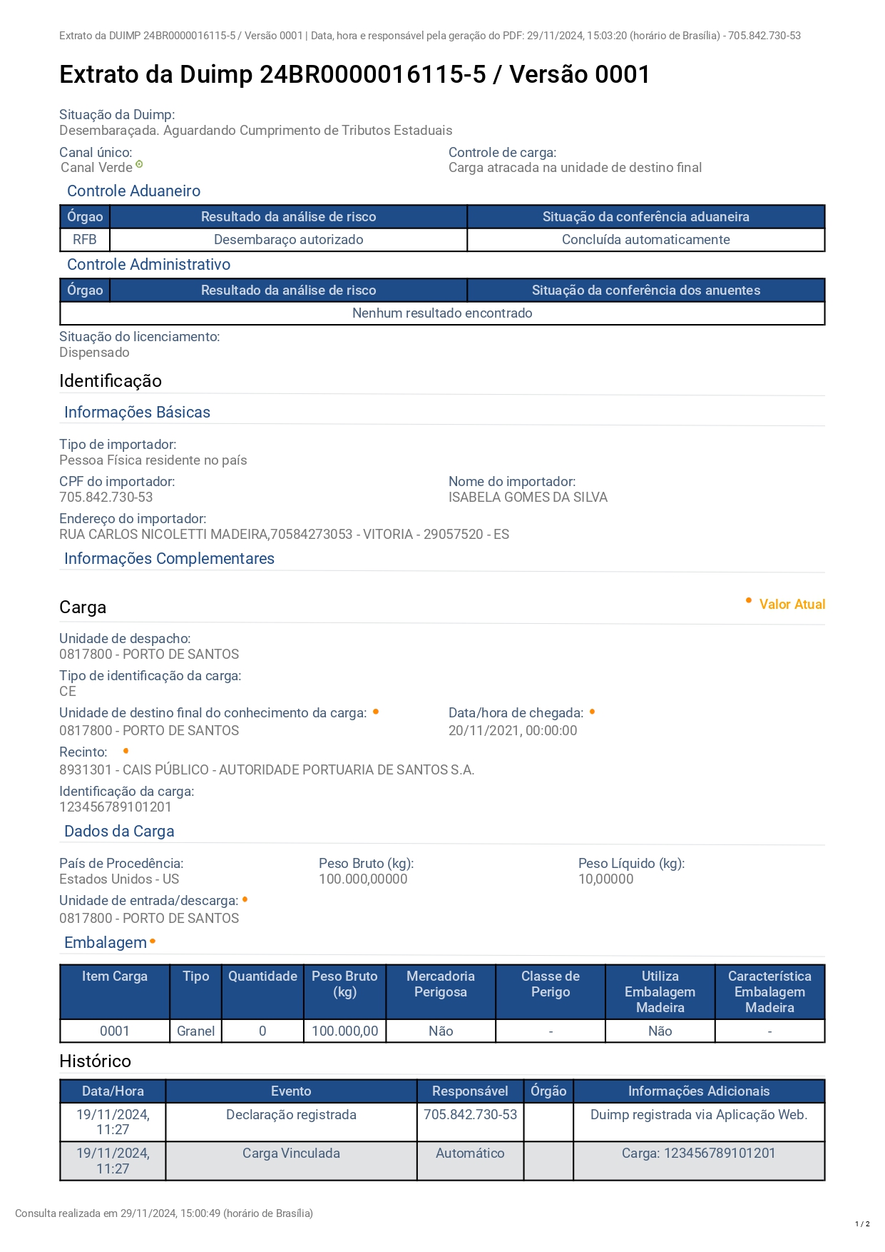 Foi desenvolvida uma versão simplificada do Extrato da Duimp, na qual é gerado um PDF com as informações sobre situação, canal único, controle de carga, controle aduaneiro, controle administrativo administrativo e os dados das abas Identificação, Carga e Histórico.