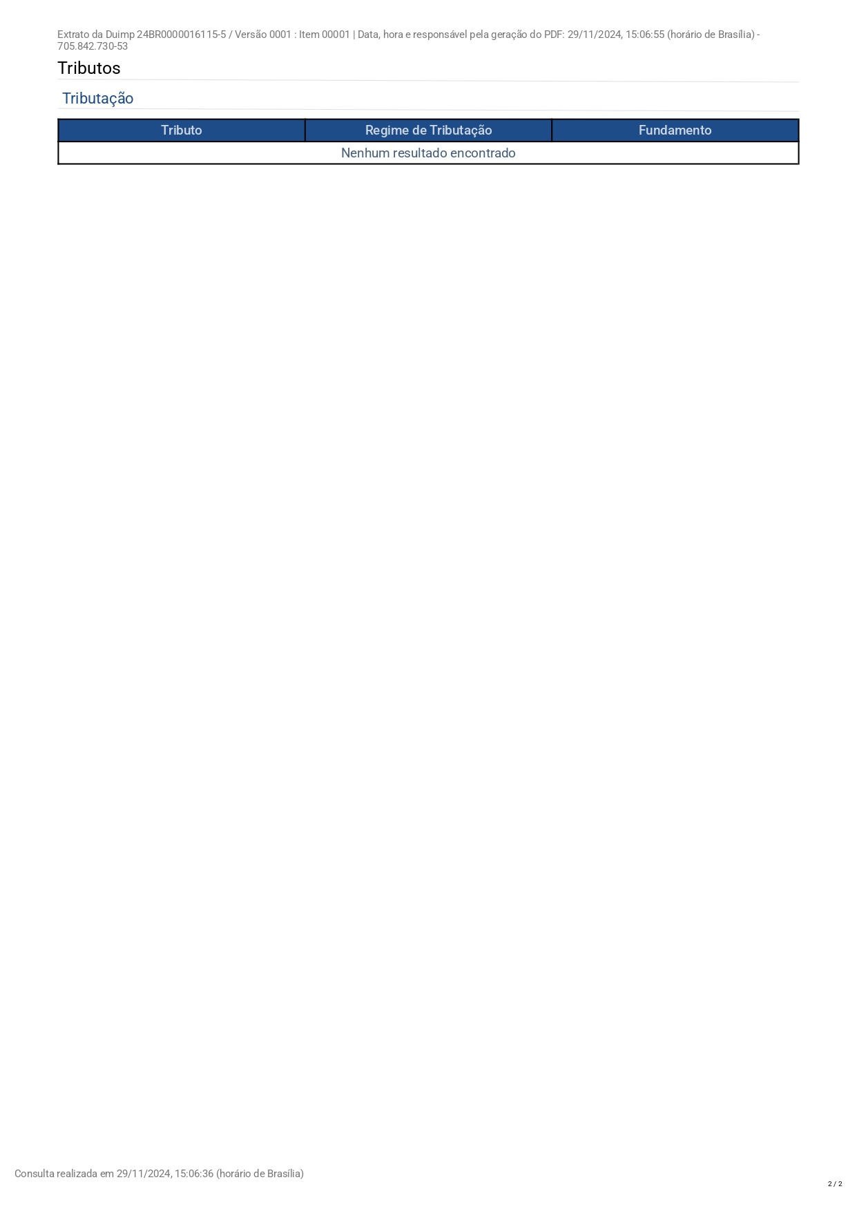 Observa-se que o extrato não contém as informações dos valores de tributos calculados pelo sistema apresentadas na Aba Tributos do Item. Desta aba, o extrato apresenta somente o quadro de tributação, que se encontrará preenchido quando o importador tiver informado um fundamento legal diferente do fundamento legal normal.