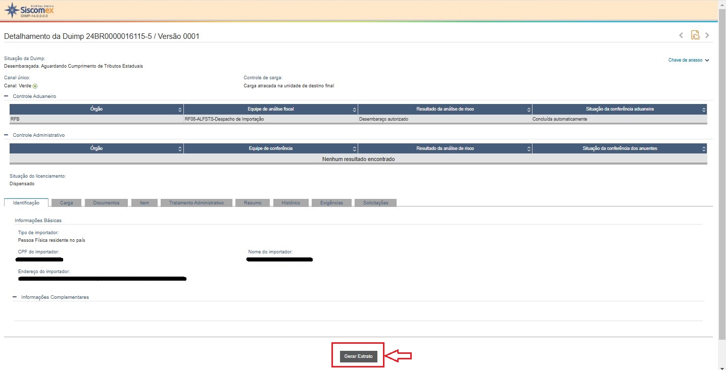 Para acessar a funcionalidade de geração do Extrato, o importador deverá consultar a Duimp e clicar no botão "Gerar Extrato" ao final da página (Figura 1).