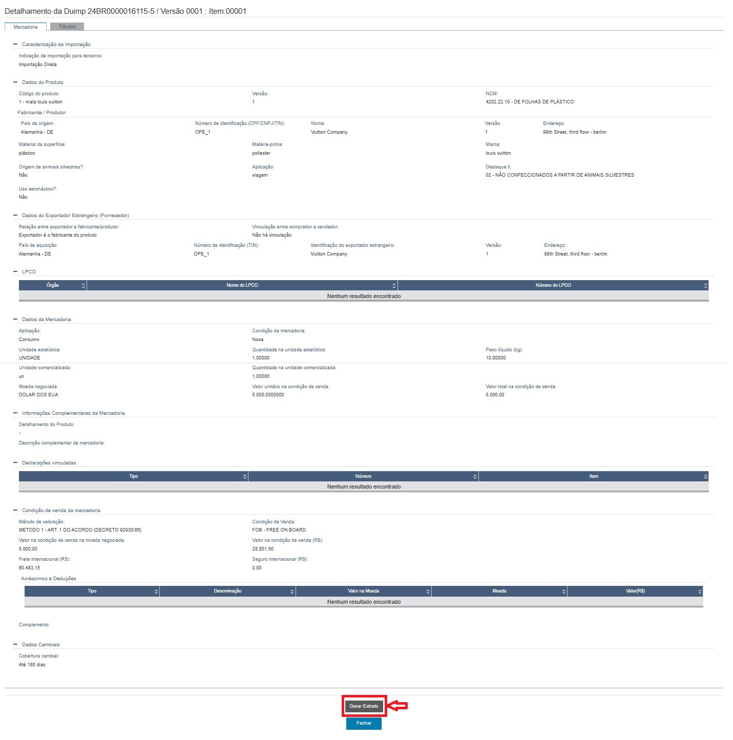 Nesta primeira versão do Extrato para imprimir os dados do item, o importador deverá consultar o item desejado e clicar no "Gerar Extrato" ao final da página da aba Mercadoria (Figura 4).