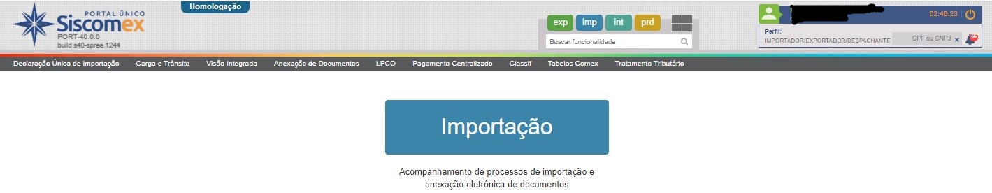 Em seguida, o sistema mostra o menu com as diversas funcionalidades relacionadas a uma operação de importação, Figura 3, listadas a seguir: