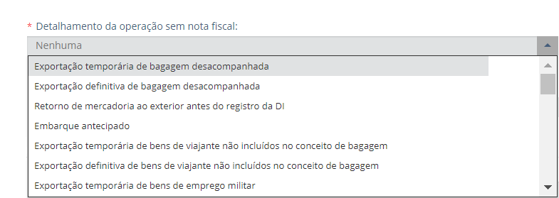 Na elaboração da DU-E sem nota fiscal, deve-se selecionar o tipo de operação na caixa de diálogo “Detalhamento da operação sem nota fiscal”, conforme abaixo: