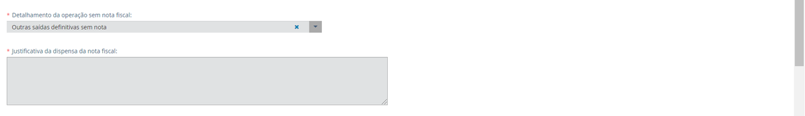 IMPORTANTE: dependendo do detalhamento da operação escolhido, poderão surgir novos campos a serem preenchidos na ficha “Informações Gerais”. Por exemplo, se escolher a opção “Outras saídas definitivas sem nota fiscal” aparece o campo “Justificativa da dispensa da nota fiscal”: