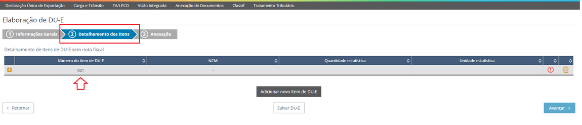 Na ficha “Detalhamento dos Itens”, cabe ao usuário adicionar um novo item de DU-E para cada NCM a exportar: