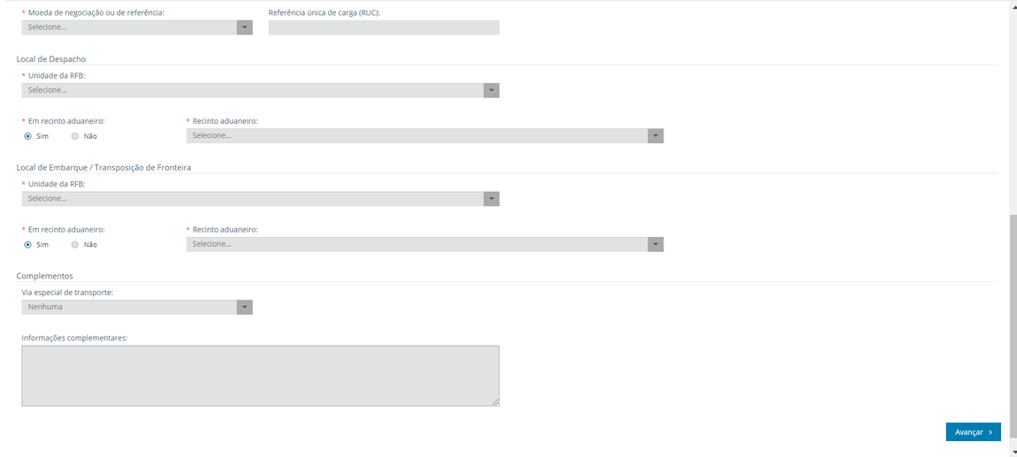 IMPORTANTE: Nestas hipóteses, a quantidade de campos a preencher é menor do que numa DU-E com nota fiscal. Por exemplo, não é solicitado informar a quantidade na unidade de medida estatística. Ademais, a DU-E sem nota fiscal somente pode ser registrada e retificada por tela.