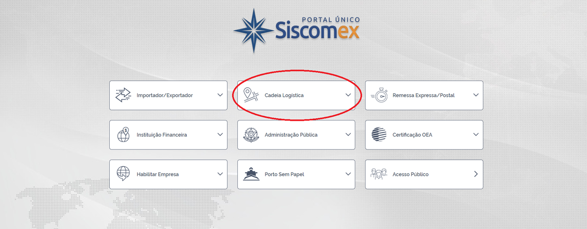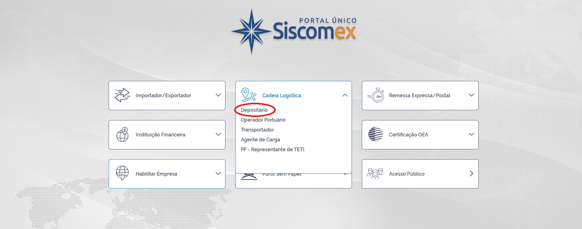 1 - O depositário deverá acessar o Portal Único Siscomex pelo endereço https://portalunico.siscomex.gov.br/portal/, selecionar a opção "Cadeia Logística" e clicar em "Depositário", conforme marcações em vermelho nas telas abaixo.