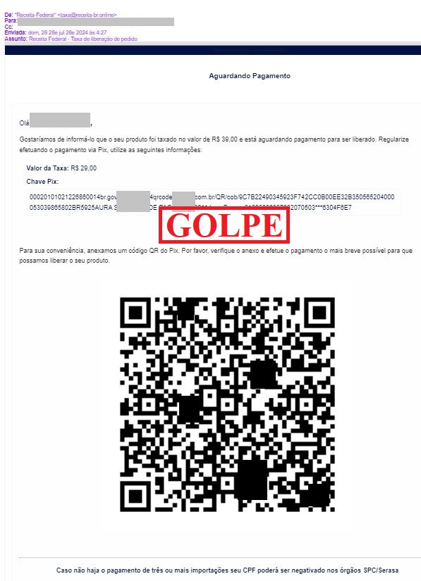 Se você recebeu um e-mail ou carta de cobrança de compras internacionais, desconfie! A Receita Federal não envia e-mails ou cartas para os destinatários.