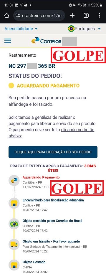- Desconfie mesmo que todos os dados como número de rastreamento, data de compra, vendedor, transportadora, estejam corretos. Não acesse pelo link enviado. Pesquise somente nos sites oficiais das empresas transportadoras.
