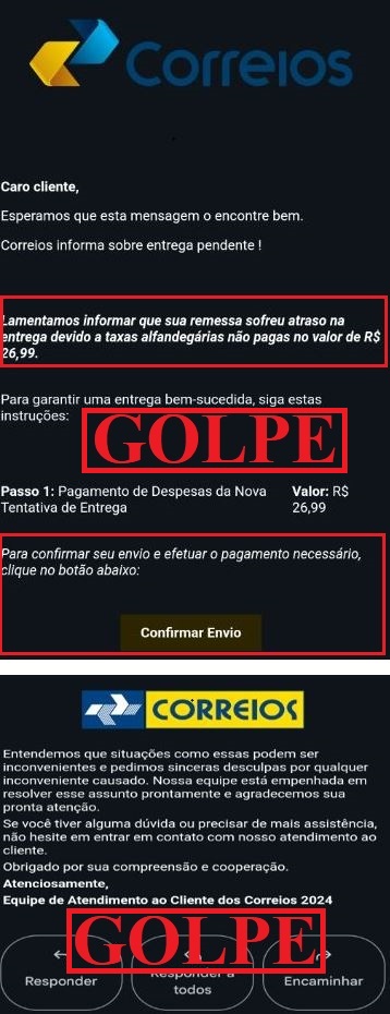- Esses tipos de golpes podem ser enviados tanto por mensagem SMS, via WhatsApp, por carta postada ou e-mail.