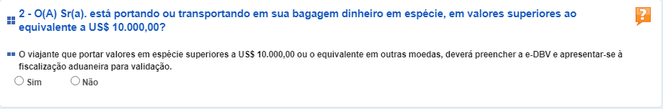 2) Pergunta: O(a) sr(a). está portando ou transportando em sua bagagem dinheiro em espécie, em valores superiores ao equivalente a US$ 10.000,00? (Figura 35)