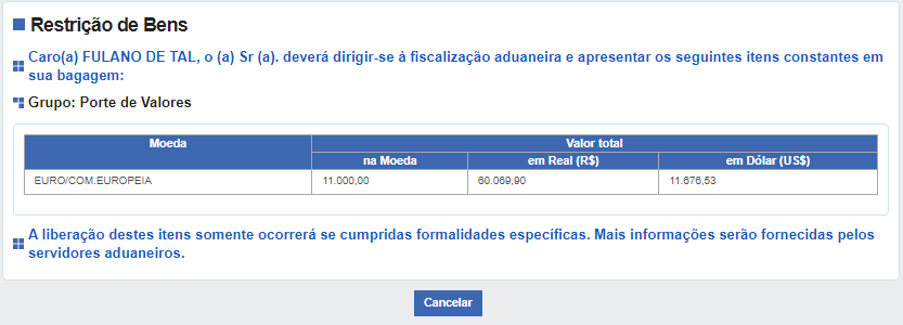 Os bens declarados pelo viajante são listados no item “Restrição de Bagagem”, separados nos respectivos grupos (Figura 39).