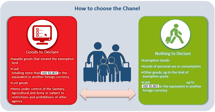 The traveler who has goods to declare must fill the Electronic Declaration of Travelers Goods (e-DBV). Upon arrival in Brazil, the traveler must choose one of the channels: "Nothing to Declare (Green)" or "Goods to Declare (Red)".