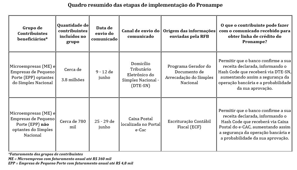 A Receita Federal iniciará envio de comunicado às Microempresas (ME) e Empresas de Pequeno Porte (EPP), com a informação do valor da receita bruta, com base nas declarações desses contribuintes ao fisco, para viabilizar a análise à linha de crédito do Pronampe, junto às instituições financeiras.