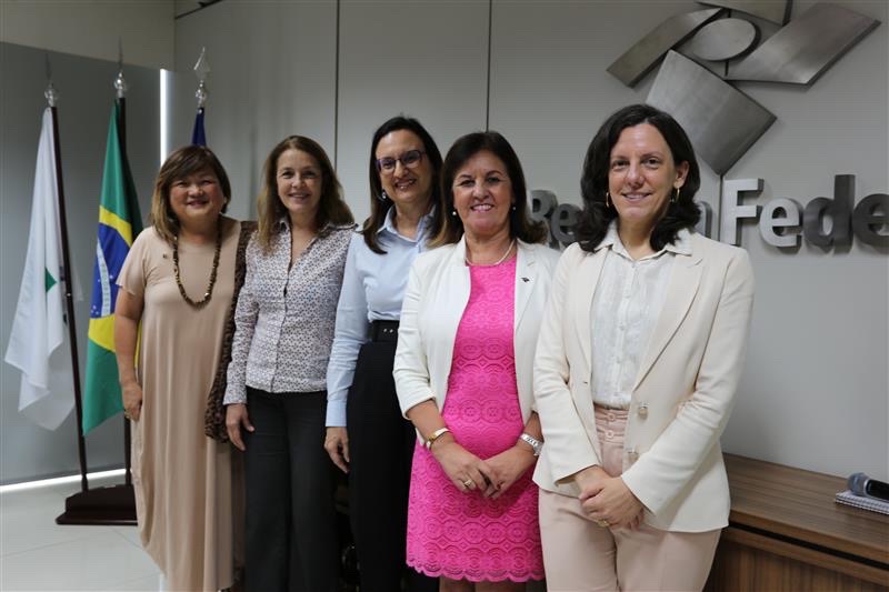 Na foto, auditora-fiscal Andrea Costa Chaves, subsecretária de fiscalização - auditora-fiscal Cláudia Regina Leao do Nascimento Thomaz, subsecretária de administração aduaneira - auditora-fiscal Adriana Gomes Rêgo, subsecretária-geral da Receita Federal - auditora-fiscal Claudia Lucia Pimentel Martins da Silva, subsecretária de Tributação e Contencioso e a auditora-fiscal Mirian Takada, chefe de gabinete.