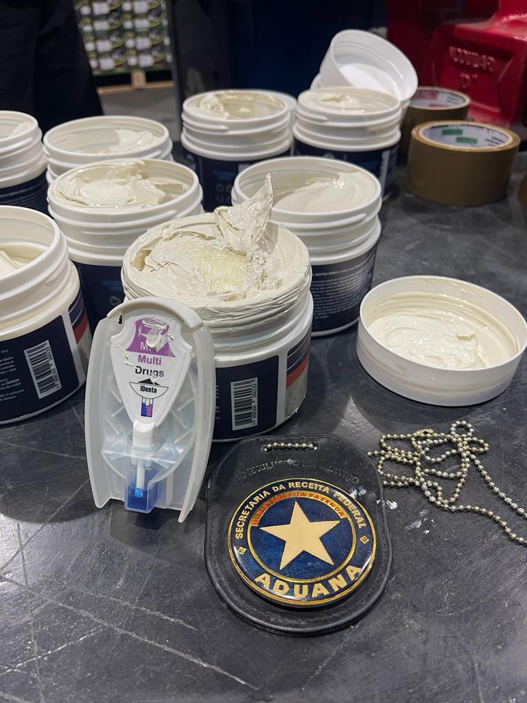 A substância ilícita foi descoberta durante a vistoria de uma carga de exportação destinada a Hong Kong, com conexão em Madrid. A droga estava oculta em 117 frascos de graxa branca, cada um contendo invólucro de 300 gramas.