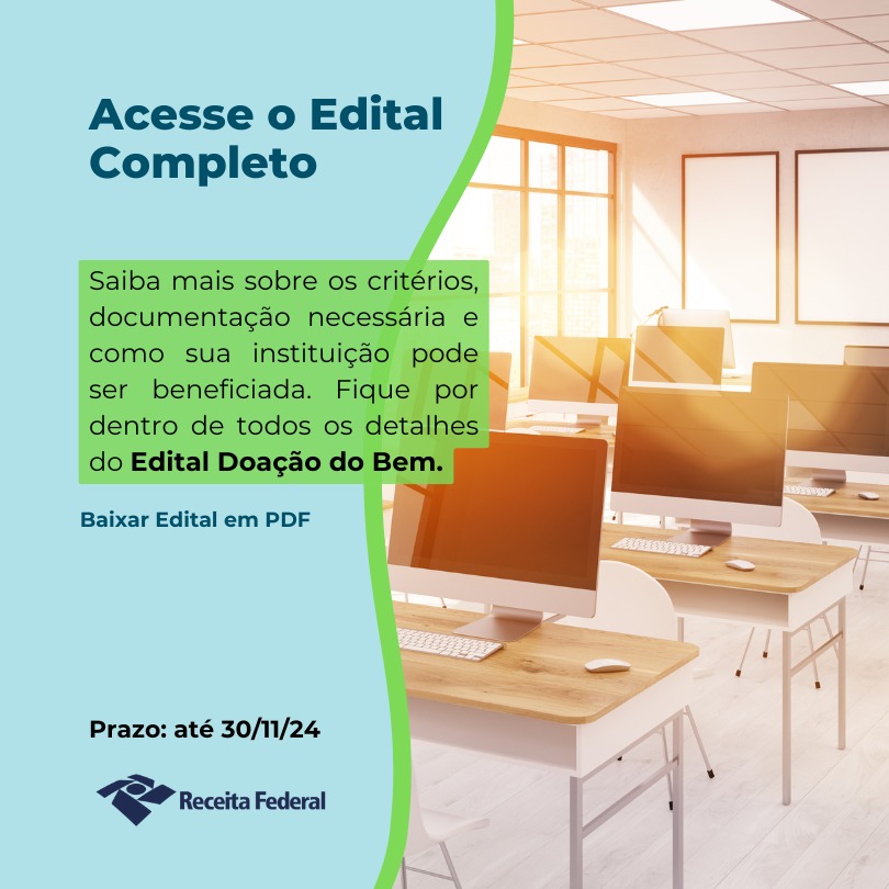 Saiba mais (Site Receita Federal do Brasil – acesse o Edital e o Manual da Doação do Bem 2024): Doações de mercadorias apreendidas ou abandonadas — Receita Federal (www.gov.br)
