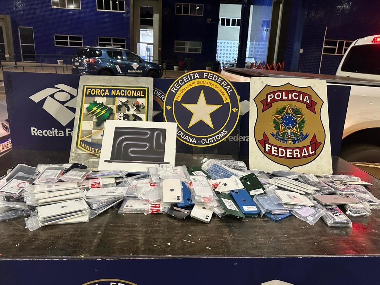 Na noite de quarta-feira (28), 171 aparelhos celulares e 1 computador foram encontrados em um fundo falso localizado no painel de um veículo. Servidores encontraram os smartphones durante uma fiscalização de rotina na Ponte Internacional da Amizade. A ação foi realizada com o apoio da Força Nacional e da Polícia Federal. O valor estimado desta apreensão é de R$250.360,00.
