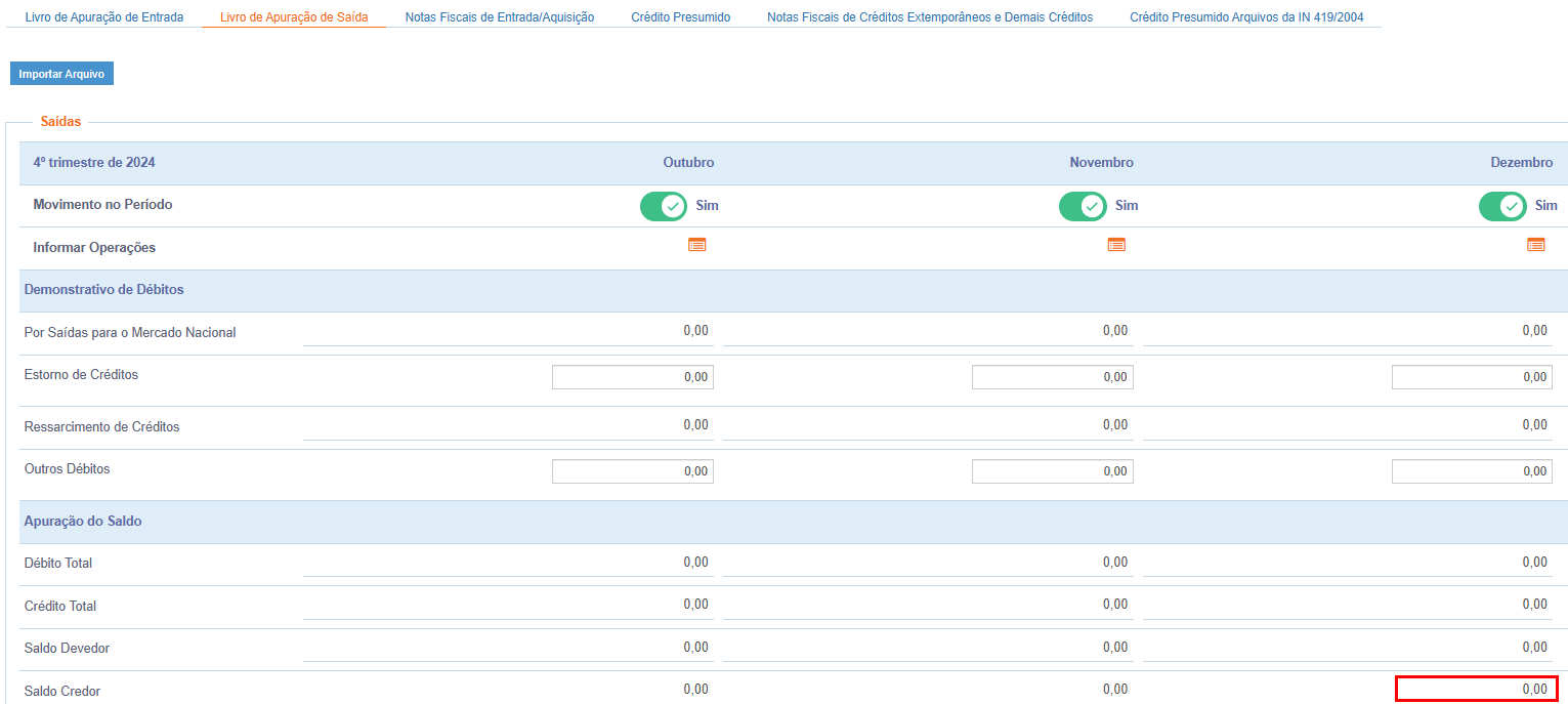 Será recuperado o valor que constou no campo "Saldo Credor" do mês Dezembro/2024, oriundo da aba "Livro de Apuração de Saída":