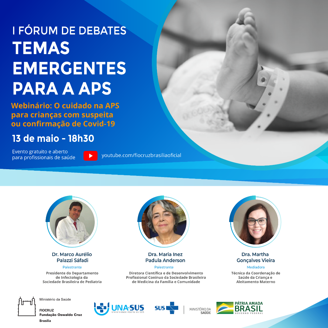 Os expositores confirmados são os médicos Marco Aurélio Palazzi Sáfadi, presidente do Departamento de Infectologia da Sociedade Brasileira de Pediatria (SBP); e Maria Inez Padula Anderson, diretora científica e de desenvolvimento profissional contínuo da Sociedade Brasileira de Medicina de Família e Comunidade (SBMFC). A mediação fica por conta de Martha Gonçalves Vieira, técnica da Coordenação de Saúde da Criança e Aleitamento Materno (Cocam/Saps/MS). Ao final, o público poderá enviar perguntas aos especialistas.