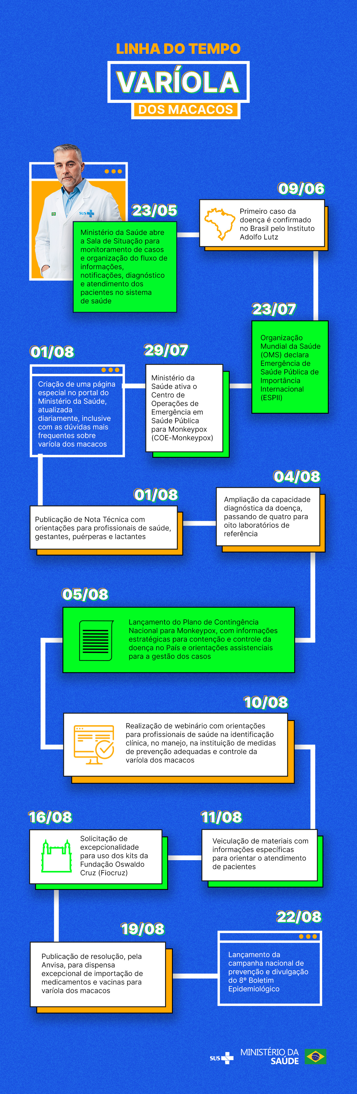 - 01/08 - Criação de uma página especial no portal do Ministério da Saúde, atualizada diariamente, inclusive com as dúvidas mais frequentes sobre varíola dos macacos