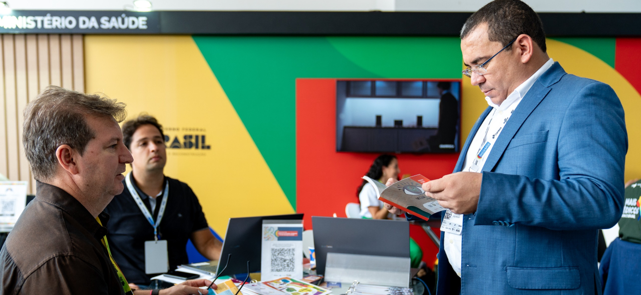 Alessandro Daltro Sousa, prefeito de Rorainópolis (RR), no estande do Ministério da Saúde (Foto: Zeca Miranda/MS)