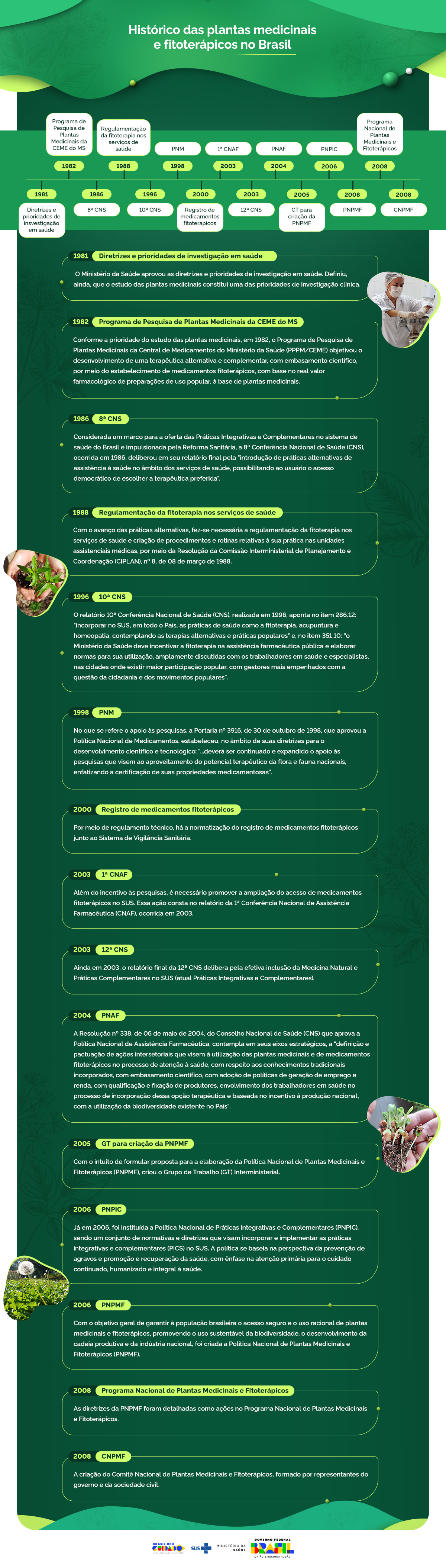 A Política Nacional de Plantas Medicinais e Fitoterápicos - PNPMF constitui parte essencial das políticas públicas de saúde, meio ambiente, desenvolvimento econômico e social para alcançar a implementação de ações capazes de promover melhorias na qualidade de vida da população brasileira.