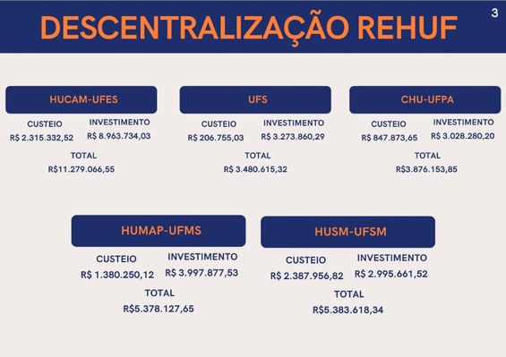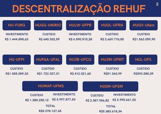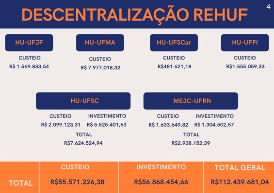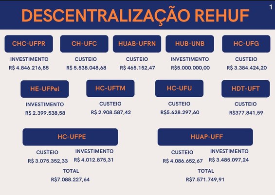 O Governo Federal destinou R$ 112 milhões para o caixa dos hospitais universitários federais da Rede Ebserh/MEC neste mês de abril. A iniciativa faz parte do Programa Nacional de Reestruturação dos Hospitais Universitários Federais (Rehuf), administrado pela Ebserh, e tem como objetivo dar apoio na aquisição de insumos e possibilitar obras e aquisições de equipamentos. Do montante deste mês de abril, R$ 55,5 milhões foram para custeio dos itens e R$ 56 milhões para novos investimentos. Em 2022, o Rehuf já liberou R$ 257 milhões para os hospitais universitários federais.