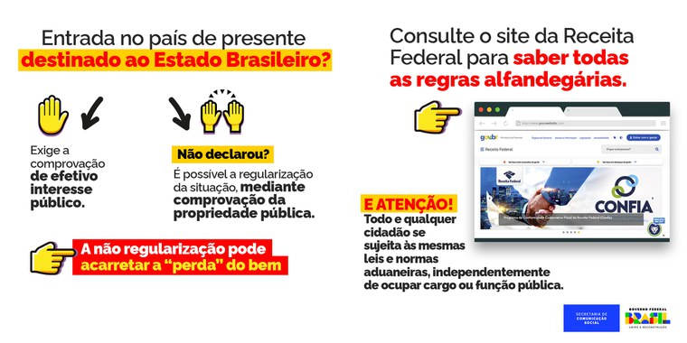 PRESENTES PARA O ESTADO BRASILEIRO - A entrada no país de presente destinado ao Estado Brasileiro é permitida, porém exige pedido de autoridade competente e comprovação de efetivo interesse público. A regularização da situação é possível, mediante comprovação da propriedade pública. Não havendo essa regularização, o bem é tratado como pertencente ao portador e, não havendo pagamento do tributo e multa, é aplicada a pena de perdimento. Após o perdimento, é possível, em tese, o bem ser levado a leilão, sendo que 40% do recurso arrecadado é destinado à seguridade social e o resto ao tesouro. É possível também, em tese, a doação, incorporação ao patrimônio público ou destruição.