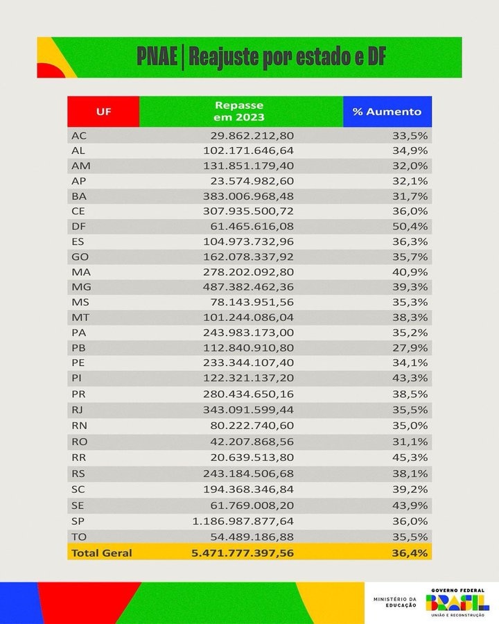 “Estados como Sergipe, Roraima, Piauí e Maranhão conseguiram aumento superior a 40%, quando comparamos com os recursos previstos para 2022. Estamos falando de comida de qualidade, essencial para o desenvolvimento das nossas crianças e jovens de todo o país”, completou o ministro.