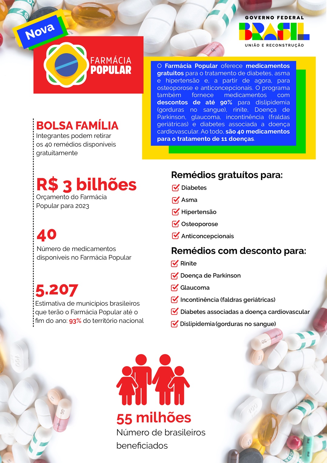 Ao todo, são 40 remédios para o tratamento de 11 doenças, num benefício para 55 milhões de brasileiros, em especial os que vivem em condição de vulnerabilidade social. Definido pela ministra Nísia Trindade (Saúde) como uma das maiores e mais abrangentes parcerias entre setor público e privado, o Farmácia Popular já contribui para a redução de 13% das internações por diabetes e 23% por hipertensão.
