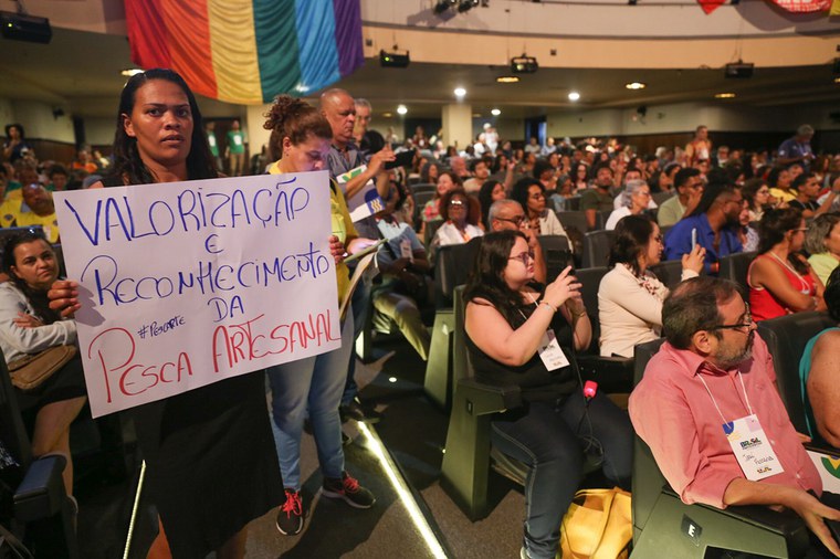 Vanessa Gaudereto, representando os pescadores: “Peço apoio nessa proposta para garantir que o Ministério da Pesca tenha a diretoria exclusiva para cuidar das políticas pertinentes aos pescadores atingidos por grandes empreendimentos. Pescadores, ribeirinhos, aquicultores familiares, essa população representa, no Brasil, cerca de 1,5 milhão de profissionais registrados.”