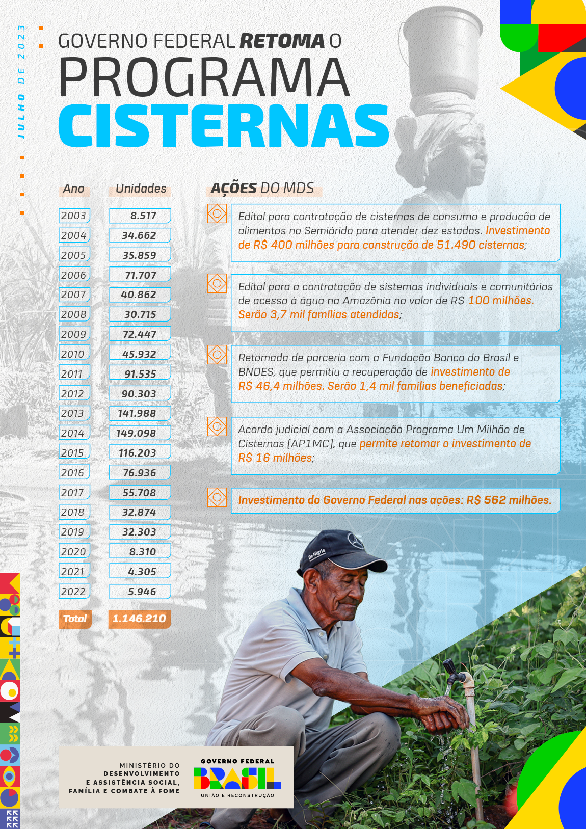 Após recuperar R$ 56 milhões que seriam perdidos por problemas relacionados à gestão anterior, o Governo Federal retomou oficialmente o Programa Cisternas, iniciativa que ajuda a criar estruturas para o armazenamento de água do período das chuvas para famílias que vivem em regiões que passam por longos períodos de seca e para ampliar o acesso à água potável em regiões desassistidas. O programa teve a escala extremamente reduzida nos últimos anos.