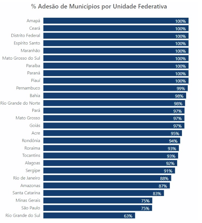 Quando se observa a adesão à política de alfabetização por Unidade da Federação , Amapá, Ceará, Espírito Santo, Maranhã, Mato Grosso do Sul, Paraíba, Paraná , Piauí e mais o D istrito F ederal têm 100% de adesão. Seguidos por Pernambuco, com 99% dos municípios ; Bahia e Rio Grande do Norte, com 98% cada. Os demais estados brasileiros tiveram adesão entre 97% e 63% dos municípios, conforme tabela a seguir.