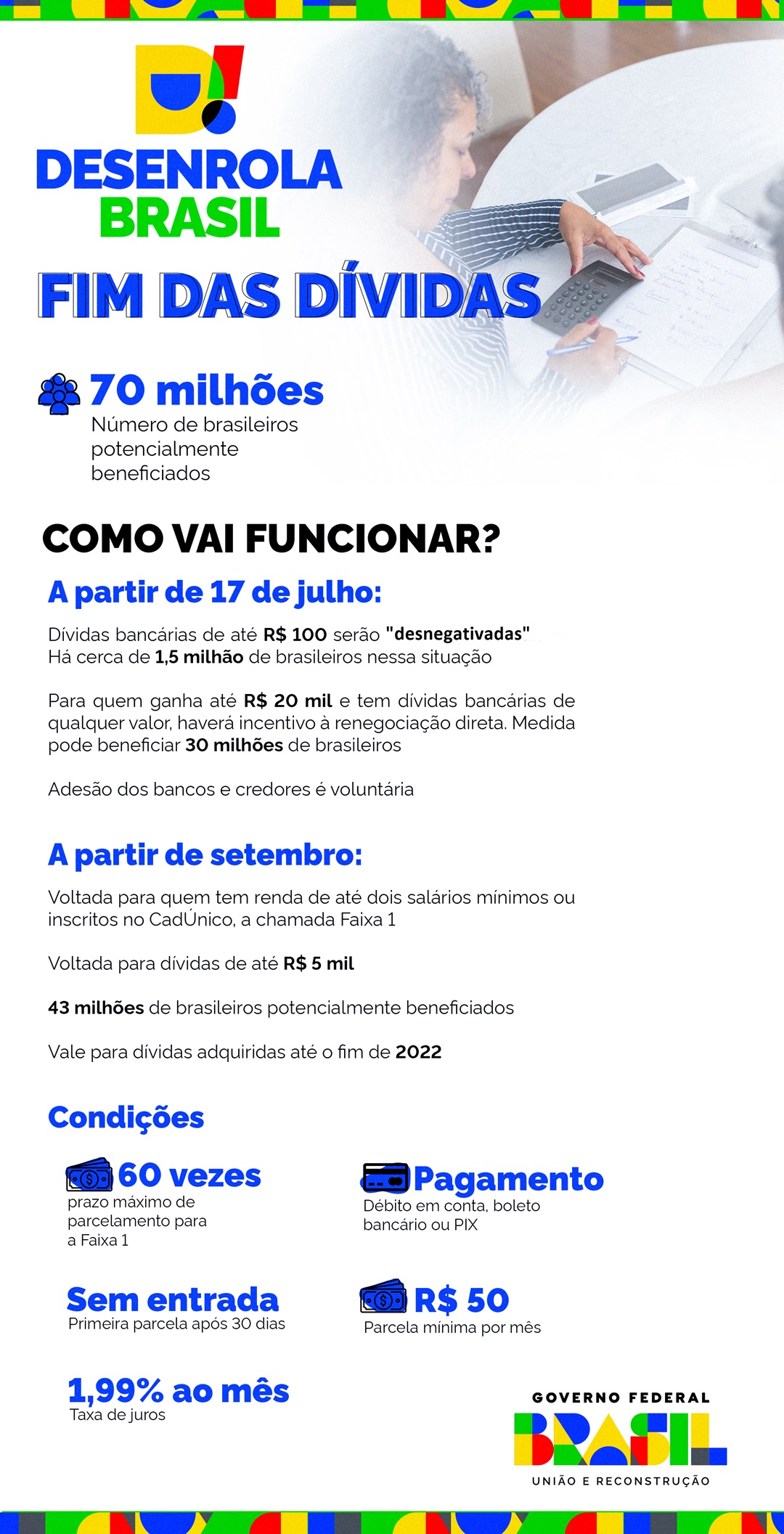 Tem início nesta segunda-feira (17/7) o Desenrola Brasil, programa do Governo Federal que vai possibilitar a renegociação de dívidas de brasileiros e tem potencial de beneficiar até 70 milhões de pessoas. Nesta sexta-feira, 13/7, foi publicada no Diário Oficial da União portaria que define requisitos, condições e procedimentos de adesão .