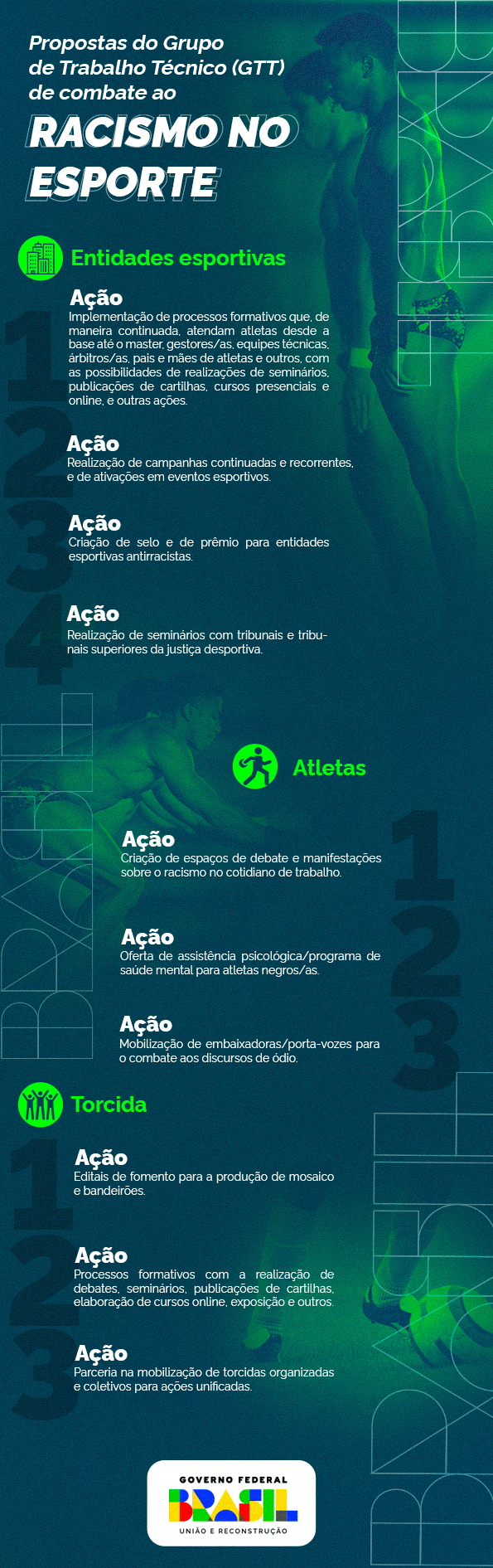O Governo Federal divulgou relatório do Grupo de Trabalho Técnico (GTT) de Combate ao Racismo no Esporte , com propostas de ações para enfrentamento do problema. Os ministérios do Esporte, da Igualdade Racial e da Justiça e Segurança Pública têm se reunido desde fevereiro para pensar estratégias contra a discriminação racial no meio esportivo.