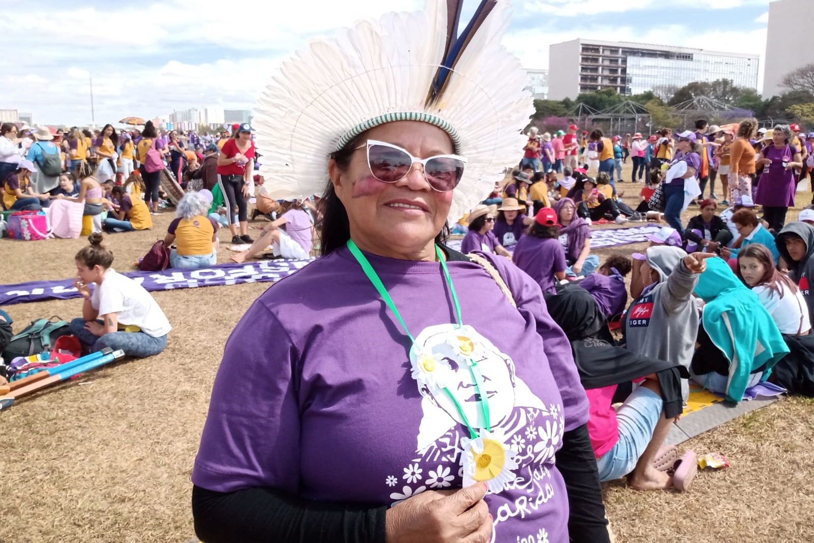 MULHERES INDÍGENAS – Do estado da Paraíba, terra de Margarida Maria Alves, vieram mais de 300 mulheres. Entre elas, 15 mulheres indígenas potiguaras, lideradas pela Comadre Guerreira. “Para nós, esse momento é uma reconstrução pelo bem-viver e de grande importância para todo povo do Brasil, especialmente para nós, mulheres e indígenas”, declarou Comadre Guerreira, que também é presidente da Associação das Mulheres Guerreiras Indígenas Potiguaras (AMGIP).
