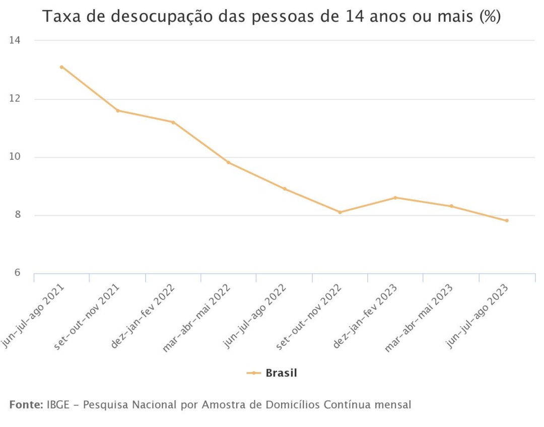 A taxa de desemprego no Brasil caiu a 7,8% no trimestre encerrado em agosto de 2023, queda de 0,5 ponto percentual em relação ao trimestre anterior, de março a maio. É o menor índice registrado desde fevereiro de 2015, quando foi de 7,5%. Em números absolutos, a quantidade de pessoas desocupadas foi de 8,4 milhões no trimestre encerrado em agosto de 2023, a menor desde junho de 2015, quando foi de 8,5 milhões. Na prática, isso significa 528 mil pessoas a menos desempregadas no país. Na comparação desde o início do ano, a queda é ainda mais expressiva: são 13,2%, ou 1,3 milhão de pessoas desempregadas a menos. Os dados são da Pesquisa Nacional por Amostra de Domicílios Contínua (Pnad Contínua), divulgada nesta sexta-feira, 29 de setembro, pelo IBGE.