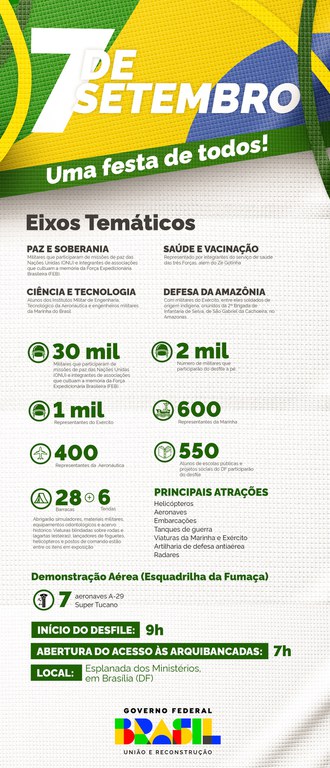 DESFILE - Com o tema “Democracia, soberania e união”, o Desfile de 7 de Setembro tem previsão de início às 9h na Esplanada dos Ministérios. A celebração, que deve durar cerca de duas horas e o público estimado é de 30 mil pessoas. A abertura será com a Fanfarra do 1º Regimento da Cavalaria de Guardas (1ºRCG), os Dragões da Independência, e o coral dos alunos do Colégio Militar de Brasília, que executarão o Hino Nacional Brasileiro e o Hino da Independência.