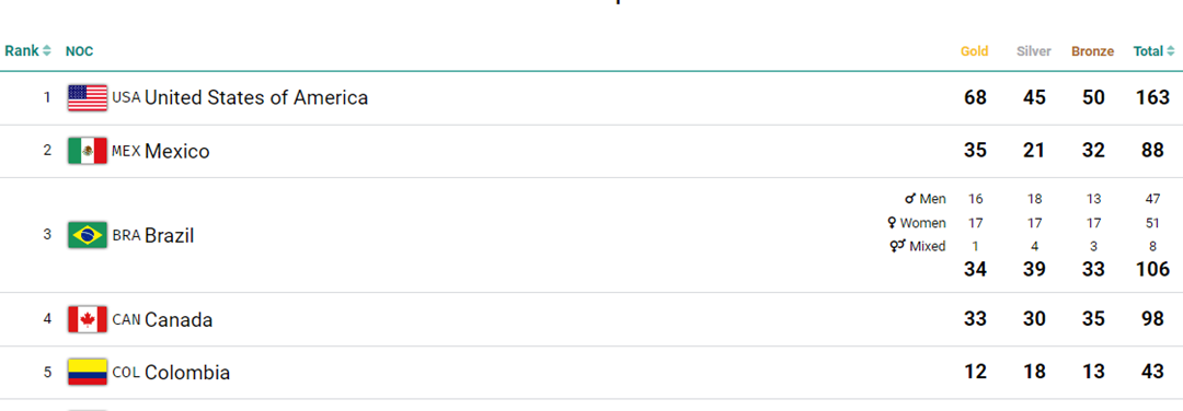 A delegação do Brasil dormiu a um ouro de superar também o México e chegar à segunda posição geral. Os mexicanos somam 35 ouros e 88 medalhas (veja abaixo). O topo do quadro segue com os Estados Unidos, com 68 ouros e 163 medalhas. Outro recorte marcante é o de gênero. Dos 34 ouros nacionais, 17 vieram no feminino, contra 16 no masculino e 1 nas disputas mistas. As mulheres somam 51 medalhas e os homens, 47. As provas mistas acumulam oito pódios.