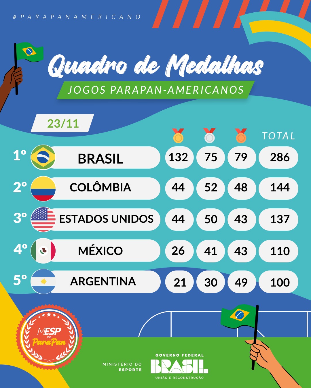 O Brasil soma medalhas, mas ainda serão disputados dois dias de competições. Além dos 132 ouros, o país conquistou 75 pratas e 79 bronzes. Das 286 medalhas conquistadas pelo Brasil, 280 têm a digital do Programa Bolsa Atleta do Governo Federal, ou seja, contaram com a participação de pelo menos um bolsista. Isso dá 97,9% do total.